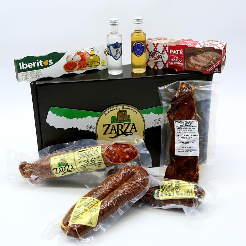 1 LONGANIZA DE SALCHICHON EXTRA, 1 LONGANIZA DE CHORIZO EXTRA, 1 MORCILLA DE PATATA, 1 TROZO DE COSTILLA ADOBADA, 1 PAQUETE DE 3 UNIDADES DE PATE DE CERDO, 1 PAQUETE DE IBERITOS (jamon, aceite y ajo), 1 BOTELLA DE GINEBRA VETTON (40ml) Y 1 BOTELLA DE RON GRANADILLA (40ml).